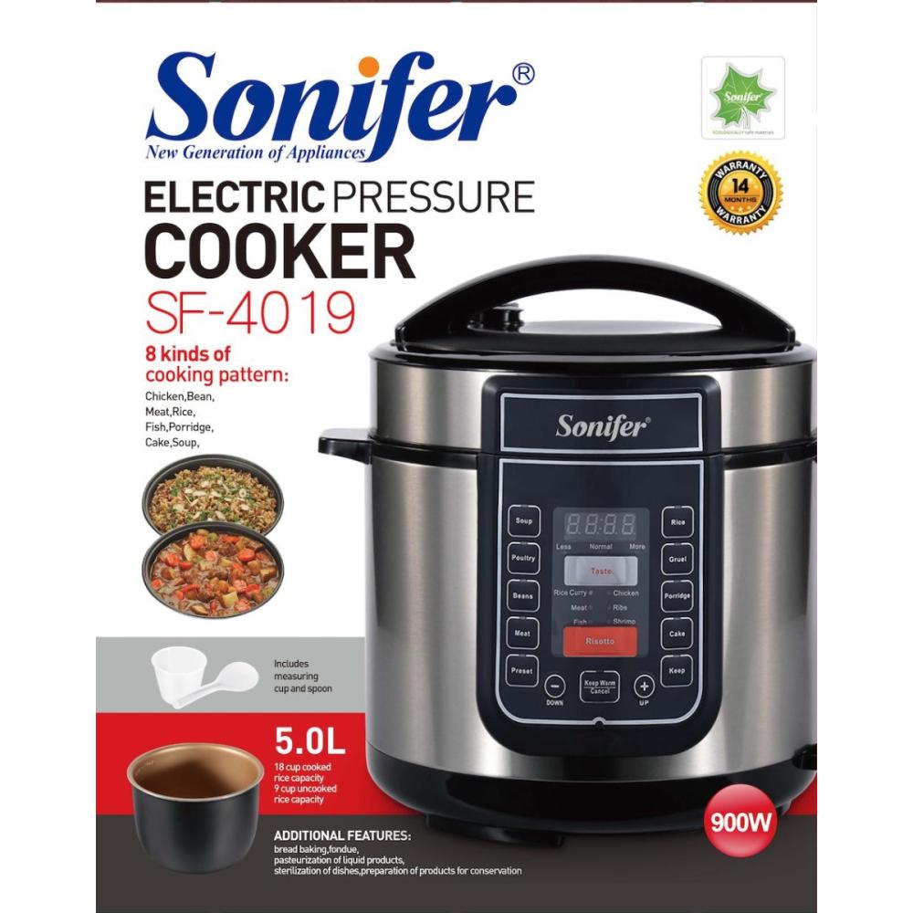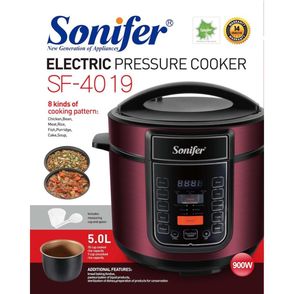 Արտադրող: Sonifer Մոդել: SF- 4019 Տարողություն: 5L Հզորություն: 900W Խոհարարության 8 տեսակ՝ հավի միս, լոբի, միս, բրինձ, ձուկ, շիլա, տորթ, այսքանը Չկպչուն ծածկույթով ներքին կաթսա Ճնշման սահմանափակող սարքի ճնշման արձակման սարք Արագ կաթսա / Դանդաղ կաթսա