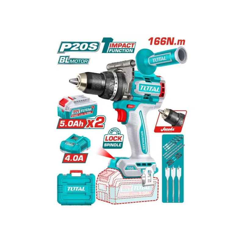 Անխոզանակ շարժիչ Լարում՝ 20V Պարապ ընթացքի արագություն՝ 0-550/0-2100 պտ/ր Հարվածների առավ․ հաճախականություն՝ 31500 հ/ր Առավ. պտտող մոմենտ՝ 166Նմ Jacobs մետաղական կոթառ Կոթառի լայնություն՝ 13մմ Մոմենտի կարգավորումներ՝ 23+1+1 Մեխանիկական 2-աստիճան փոխանցում Իլի կողպման գործառույթ Ինտեգրված LED աշխատանքային լույս LED մարտկոցի վառման ցուցիչ Ներառում է՝ 3 հտ փայտի հարթ գայլիկոն (16, 19, 22մմ) 3 հտ քարային գայլիկոն (5, 6, 8մմ) 3 հտ HSS գայլիկոն (4, 5, 6մմ) 2 հտ 65մմ հարվածային բիթ (PH2+PH2, PH2+SL6) 1 հտ օժանդակ բռնակ, 2 հատ 5 Ա Մարտկոց և արագ լիցքավորիչ ։Փաթեթավորված է գունավոր տուփով։