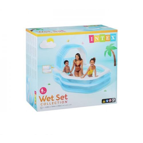 Օրիգինալ փչովի օվալաձև լողավազան INTEX 57186 ստեղծվել է 3 տարեկանից երեխաների համար։ Այն բավականին պարզ ձևավորված է, լողավազանի պատերը թափանցիկ են, ինչը անպայման կհետաքրքրի երեխային։ Հագեցած է արտահոսքի փականով: Կողմերը բաղկացած են երկու օղակներից, որոնցից յուրաքանչյուրը փքվում է առանձին։ Լողավազանն ունի հովանոցով ծածկված նստատեղ, որտեղ կարելի է նստել։
