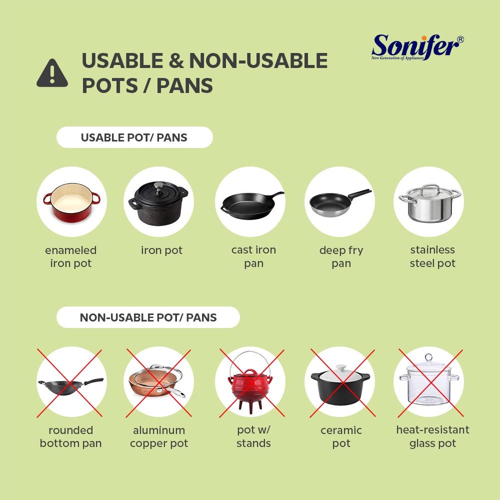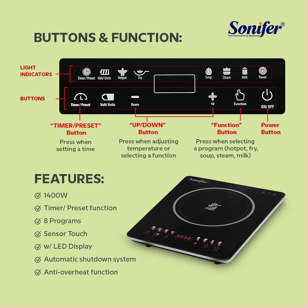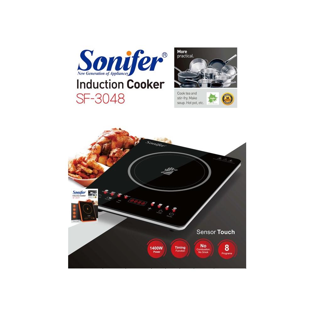 Արտադրող: Sonifer Մոդել : SF-3048 Հզորություն: 1400W Power supply: 220V Մուտքային հոսանք: 220V Բարձր արդյունավետության ինֆրակարմիր ջեռուցման սկավառակ Առանց այրման, առանց ծխի և ածխածնի Առաջին մակարդակի բարձր ջերմաստիճանի ապակե կերամիկա Սենսորային կառավարումով