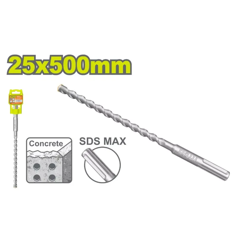 Սռնակ՝ SDS Max Տրամագիծ՝ 25 մմ Երկարություն՝ 500 մմ Հարմար է բետոնի, մարմարի և աղյուսի վրա անցքեր բացելու համար Փաթեթավորված է պլաստիկե կախիչի վրա