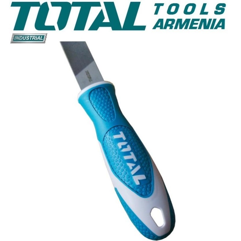 TOTAL THT91886 - ը ունի փոքր չափս , որը թույլ է տալիս այն միշտ պահել ձեռքին ՝ շարժական գործիքի տուփի մեջ , գործիքների սայլակի մեջ և այլն : Սարքի բռնակը ունի անցք մեխից կամ օղակից կախելու համար : Այս մոդելը նախատեսված է մետաղական արտադրանքի գոգավոր մակերեսների արդյունավետ մշակման համար : Աշխատանքային մասի նյութը ` CS պողպատ :