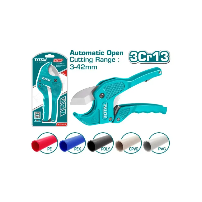 TOTAL THT53425 - ը ձեռքի գործիք է , որն օգտագործվում է կապի համակարգերի հետ տեղադրման և ապամոնտաժման աշխատանքներում : Իր օգնությամբ կտրվում են 3 - 42 մմ տրամագծով ջեռուցման և ջրամատակարարման համար նախատեսված ՊՎՔ խողովակները : Սուր կտրող եզրերը ապահովում են կոկիկ կտրվածք , որը չի վնասում աշխատանքային կտորները և չի թողնում փորվածքներ :